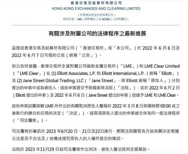 11月29日,港交所发布公告称,英国法院确认,针对伦敦金属交易所于2022年3月采取的行动而提出的索赔要求均被驳回。两家美国对冲基金Elliott和Jane Street因“伦镍风波”诉LME的案件被裁定败诉。