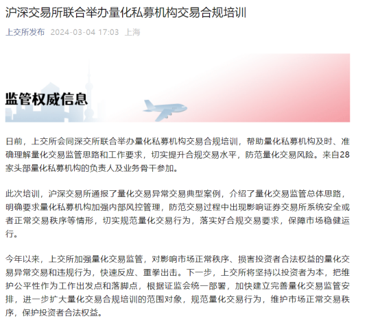 3月4日,沪深交易所披露了一则近日联合举办量化私募机构交易合规培训的消息,引发关注。这也是继2月20日对量化巨头的异常交易行为开出罚单后,关于量化私募交易监管问题再度发声。