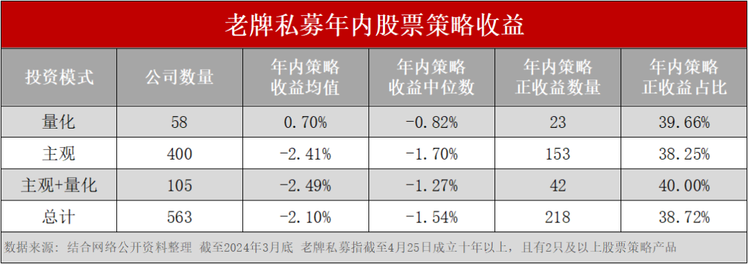 截至4月25日,成立十年以上的老牌私募共563家,其中主观私募400家,量化和“主观+量化”双驱私募分别为58家和105家。其中老牌量化私募业绩领先,股票策略收益均值为0.7%,主观私募次之,双驱私募垫后。