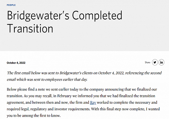 全球最大对冲基金桥水“交班” 近日,全球最大对冲基金公司桥水创始人瑞·达利欧将所有投票权转让给董事会,并辞去桥水三位联席首席投资官之一的职务。 量化私募免管理费引关注 近日,一家量化私募免除旗下十几亿产品的半年管理费,引发业内关注。据记者了解,由于今年私募产品收益不理想,不少私募机构采取了减免旗下产品管理费,或暂缓超额计提等措施。